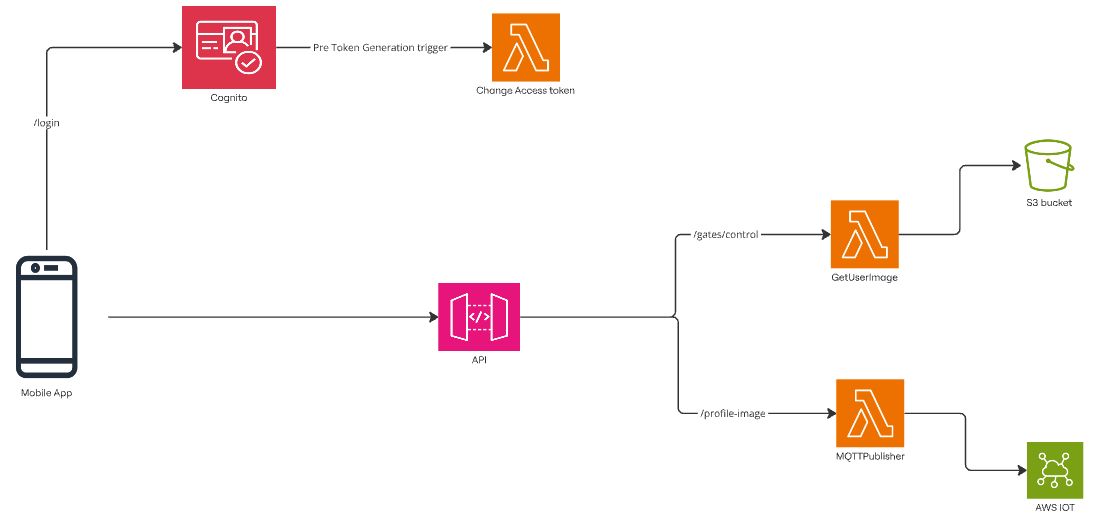 2. Home screen After logging in, the home screen is displayed, and in the top left, you can see the profile image retrieved from the /v1/profile-image endpoint (as we implemented earlier). Both buttons in the UI call the /v1/gates/control/ endpoint to publish a message on AWS IoT MQTT.